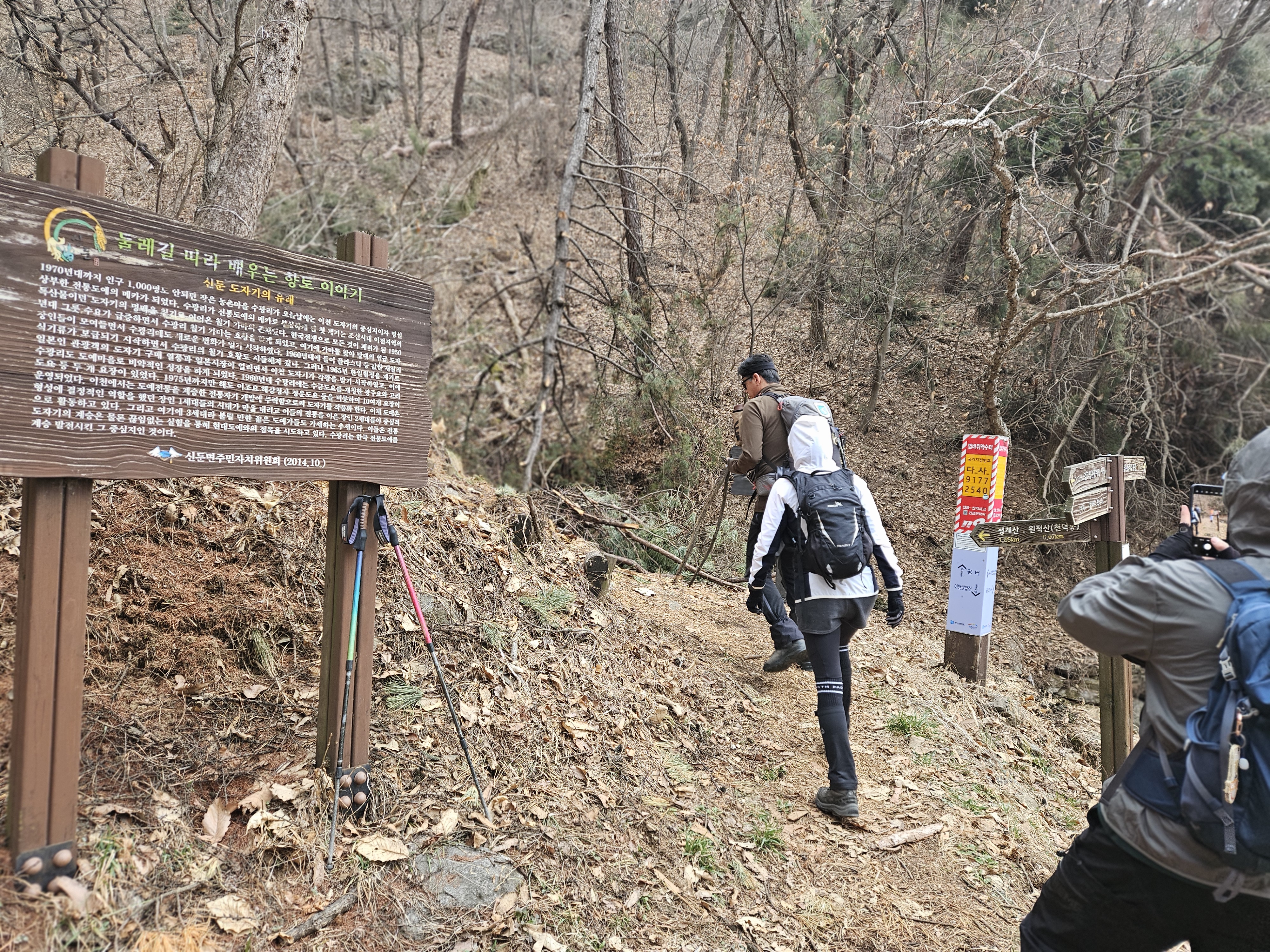 정상에서 인증샷을 남겼다면 이제 마지막 하산길입니다. 이 코스는 이천 원적산 산수유마을 주차장 방향으로 완만하게 이어지는 길인데요, 나무 계단과 흙길이 번갈아 나타나서 무릎에 부담이 덜합니다. 하산하는 도중에 낙수재폭포도 만날 수 있고, 이천 산수유마을도 거쳐갑니다.
